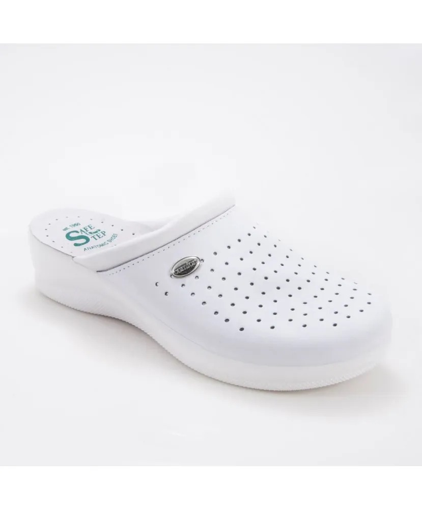 Δερμάτινο Γυναικείο Σαμπό σε Λευκό Χρώμα με Ανατομικό πάτο .Το ύψος της σόλας είναι 2,5 εκ. και είναι κατάλληλο και για επαγγελματική χρήση χάρη στην αντιολισθητική του σόλα . Αντικραδασμικό και ξεκούραστο περπάτημα .