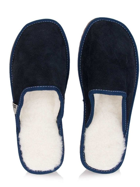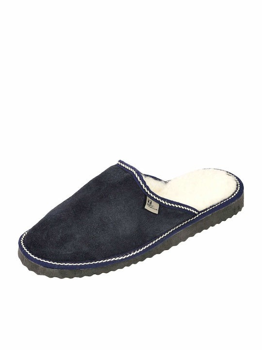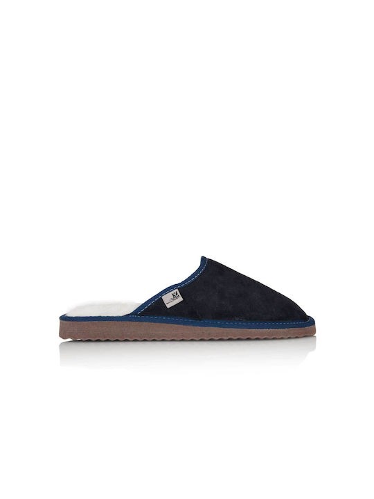 Ανδρικές Μπλε Δερμάτινες Παντόφλες Καστοριάς με Γούνα Εσωτερικά